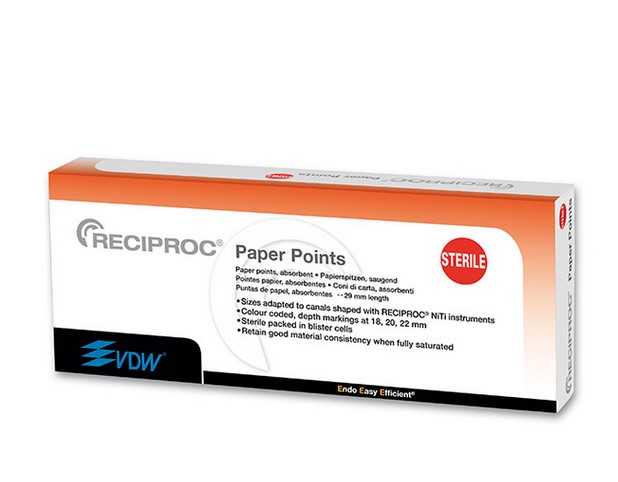 Las puntas de papel Reciproc de VDW se venden en paquetes de 144 unidades para el sistema NiTi Mtwo. Vienen en celdas de blíster para facilitar el control de infección. Las puntas de papel Mtwo vienen con marcas de longitud a los 18, 20 y 22mm. Aún empapadas, las puntas mantienen una buena consistencia de