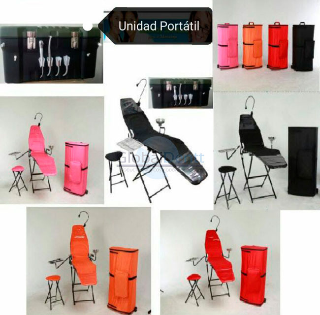 Módulo 4 servicios – Motor compresor aire seco 3/4 H-P – Jeringa triple – Conexión borden micromotor – Conexión borden pieza de mano – Succión de saliva – Tanque agua – Mangueras lisas asépticas – Caja plástica resistente – Dimensiones AL 30 x AN 54 FO 30 cms – Peso 13kilos SILLÓN – Sillón plegable – Tres niveles de altura – Lámpara Led 110V – Escupidera en acero inox – Bandeja en acero inox – Butaco Odontólogo – Maleta viaje con ruedas – Dimensiones Al 100 x FO55. X AN18 cms – Peso 18kilos